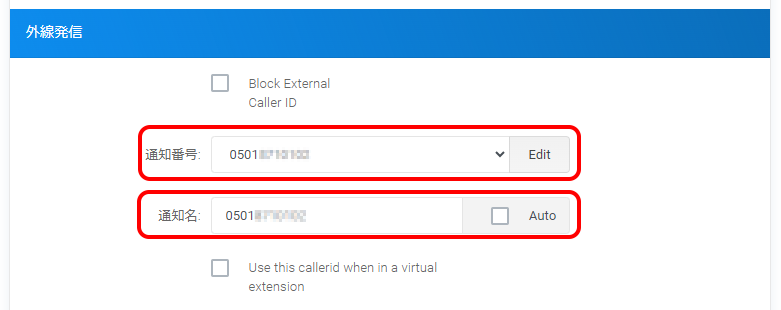 | 通知名 | ・050-1から始まる番号を利用する場合 「通知番号」で指定した外線番号と同じ番号を入力します。 ・番号ポータビリティまたは新規取得した0ABJ番号(03から始まる番号等)を利用する場合 0ABJ番号(03から始まる番号等)を入力します。 |