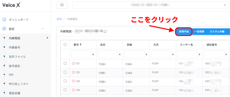 VoiceX管理画面で、内線番号を登録する方法について説明します。