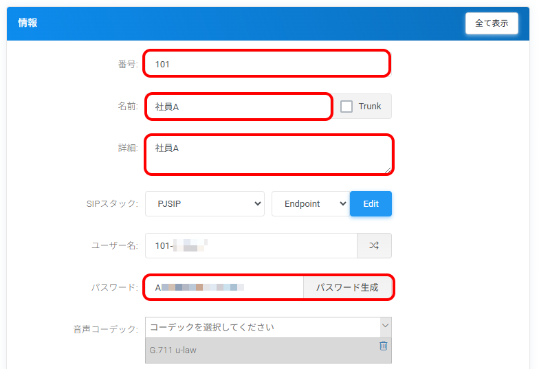 | パスワード | 内線のパスワード(半角英数)を入力します ※「パスワード生成」をクリックすると、半角英数16桁のランダムな文字列で自動生成されます |