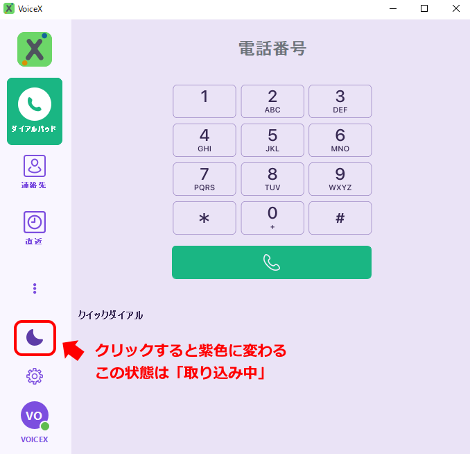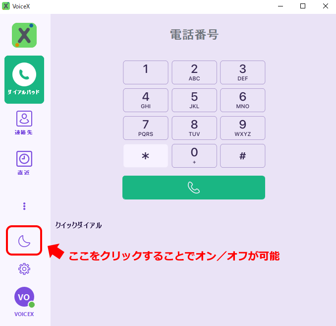 弊社から案内しているPC向けソフト「VoiceX Desktop」を起動している間は、常に着信を受けられる状態にあります。