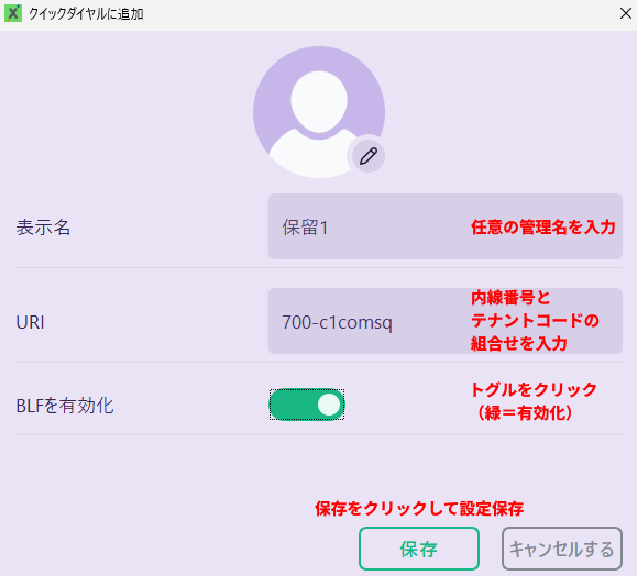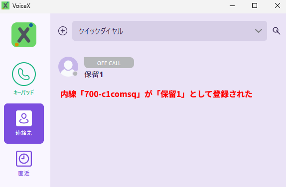 下図は、テナントコード「c1comsq」の内線番号「700」を「保留1」ボタンとしてVoiceX Desktopの連絡先へ登録している様子です。