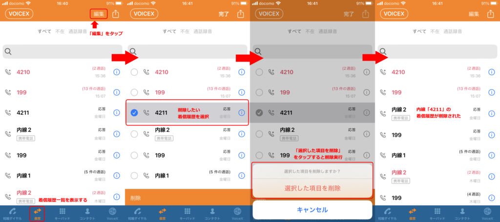 削除したい対象をタップし、画面下部の「削除」から「選択した項目を削除」と進むことで選択した着信履歴を削除することができます。