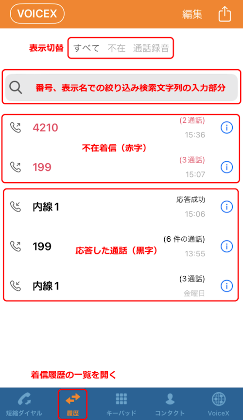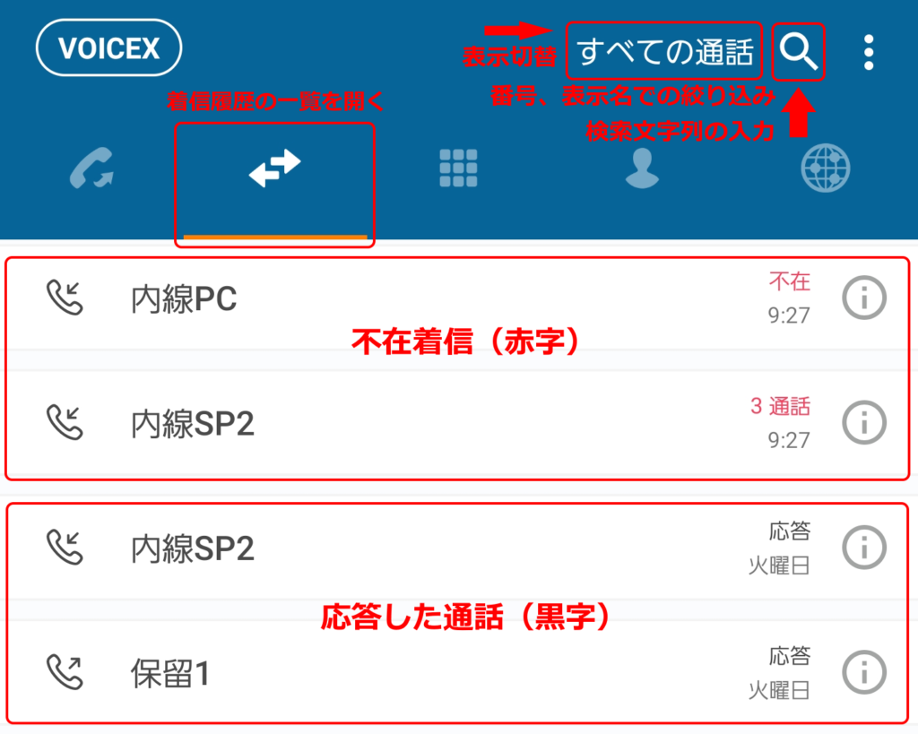 弊社から案内しているスマートフォン向けアプリ「VoiceXモバイル」で、通話履歴を確認する方法を説明します。