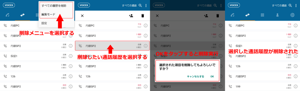 「すべての履歴を削除」をタップすると、アプリ上のすべての着信履歴を削除します。「編集モード」をタップすると、削除したい対象を選択し、選んだ履歴のみを削除することができます。