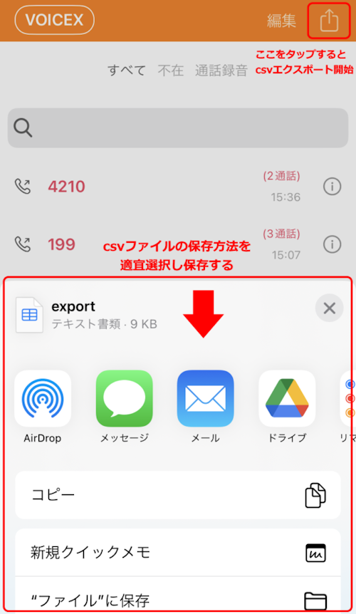 通話履歴のcsvファイルエクスポート(iOSのみ)