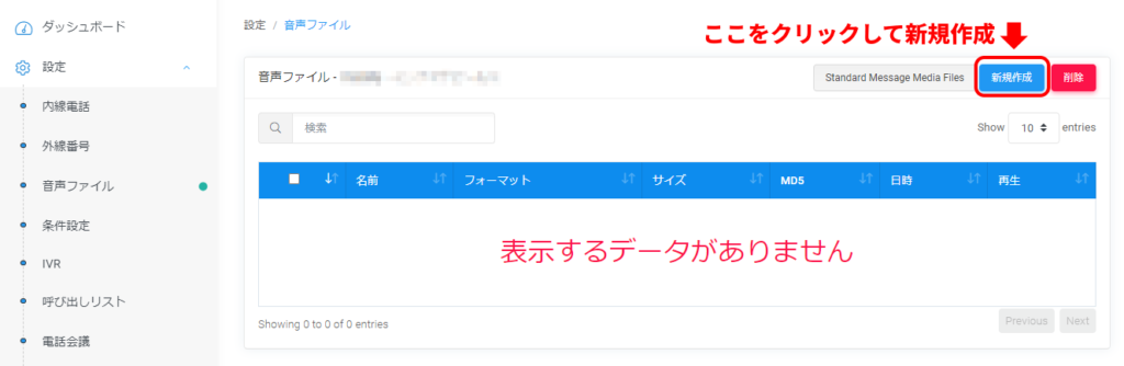 音声ファイルのアップロードを行いたい場合は、一覧画面右上の青い「新規作成」ボタンをクリックし、設定画面を開きます。
