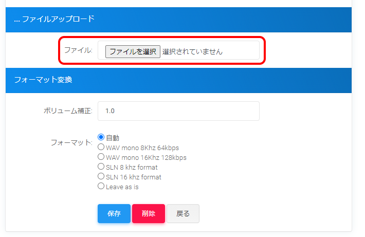 「ファイル」にてアップロードしたい、あらかじめ録音・用意いただいた音声ファイルを指定してください。(音声ファイルはmp3ファイルに変換され登録されます)