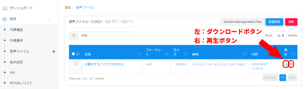 音声ファイルのダウンロードを行いたい場合は、該当の音声ファイル登録行の右側にあるダウンロードボタンをクリックすると、音声ファイルをダウンロードすることができます。