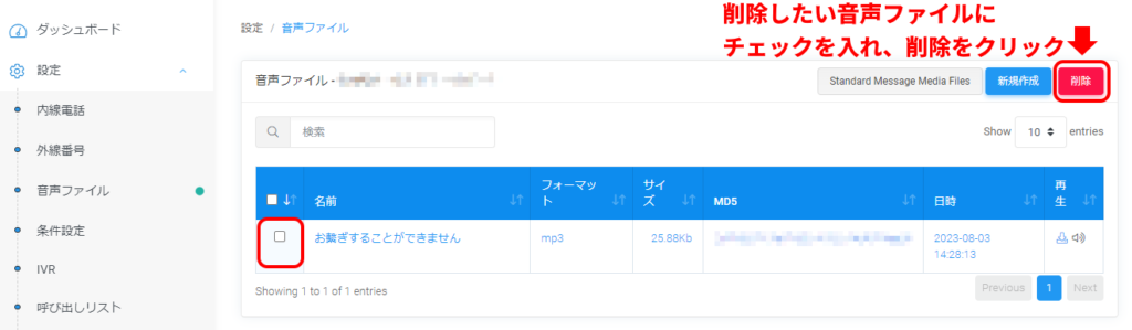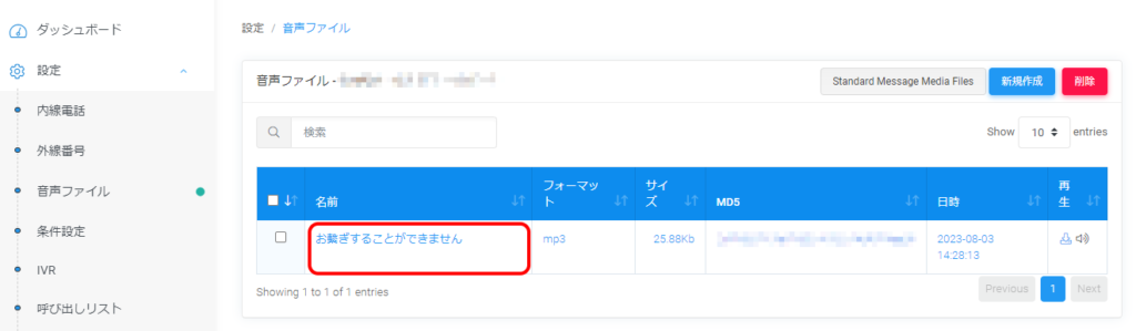 画面左メニューの「音声ファイル」を開くと、登録されている音声ファイルの一覧画面が表示されます。