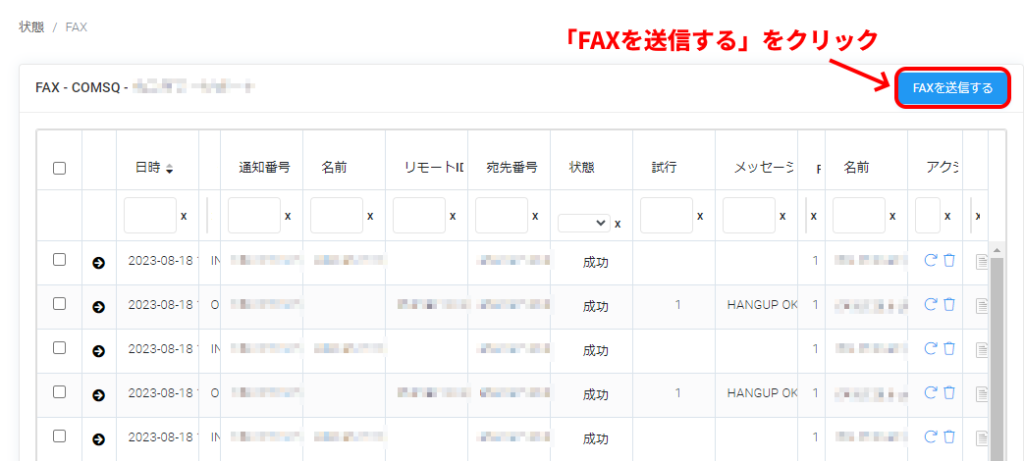 状態カラムで「成功」と表示されると、FAX送信は正常に完了しています。