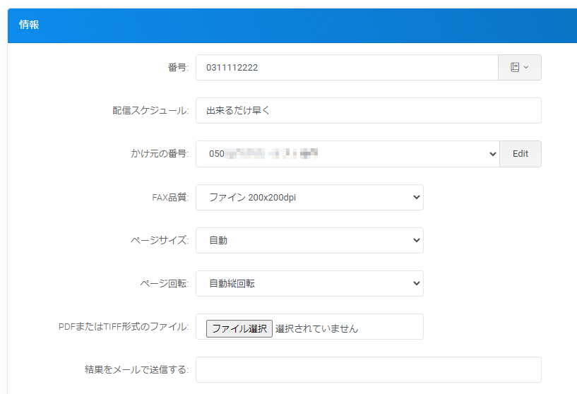 FAX送信先の番号等、下記の必要な情報を入力後、下部の青い「送信」ボタンをクリックするとFAXを送信することができます。