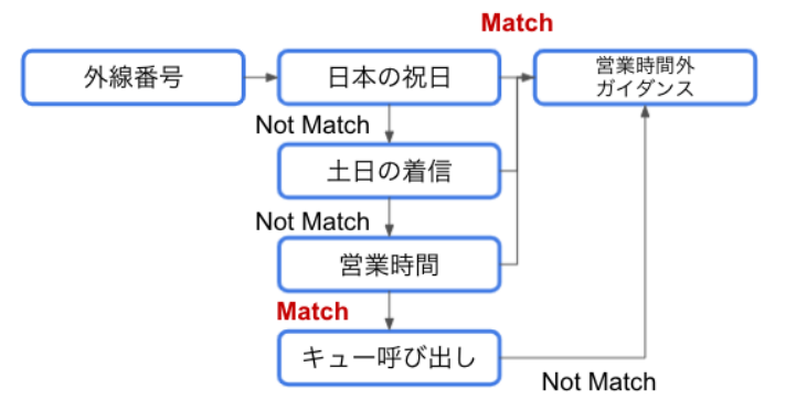 この場合、「日本の祝日」→「土日」→「営業時間」と順に判定を行い、営業時間内であった(条件に一致した)場合はキューの呼び出しを行い、営業時間外であった(条件に一致しなかった)場合は「営業時間外」のガイダンス音声が流れます。