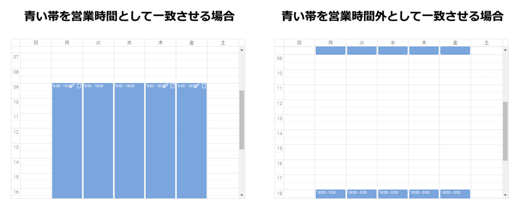 青い帯はあくまでも一致する時間の表現になりますので、青い帯を営業時間として登録しても、営業外の時間として登録しても構いません。それぞれに応じて、適宜一致した時・一致しなかった時の宛先を指定してください。