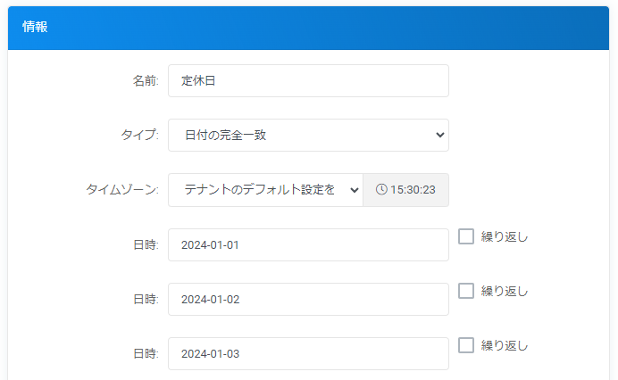 内閣府で定められた国民の休日を一括で設定したい場合、あらかじめ用意された条件「日本の祝日」を選択することで、1日ずつ指定することなく一括で設定することが可能です。