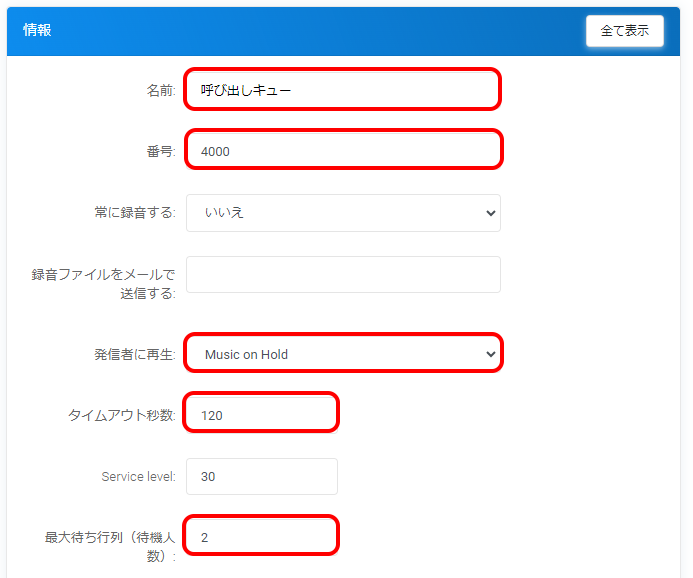 | タイムアウト秒数 | キューのタイムアウト秒数を指定します。 この設定秒数分、発信者を待機させることができます。 |
