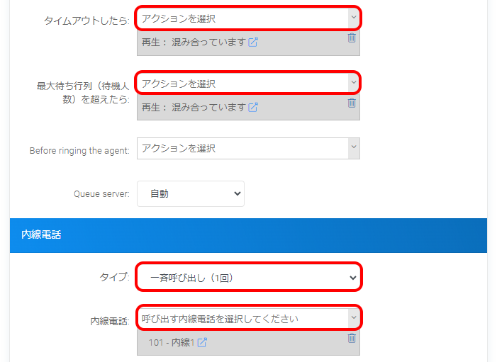 続けて、タイムアウトした場合の動作、最大待ち行列(待機人数)を越えた着信が来た場合の動作、キューの宛先設定等を設定します。
