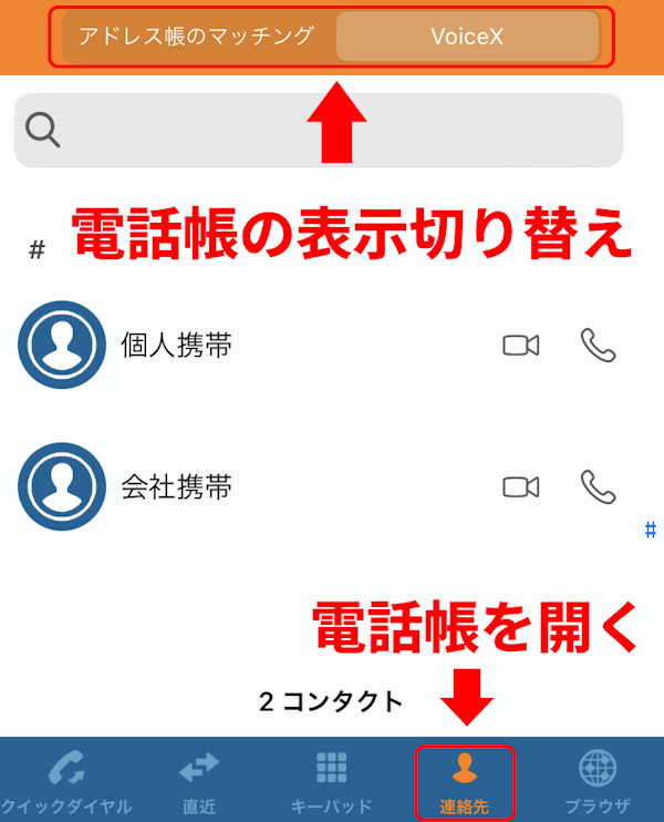 その後、上部メニューにある検索アイコンの左側にある「アドレス帳のマッチング」という文字をタップし、プルダウンから「VoiceX」を選択すると、連携した電話帳が表示されます。