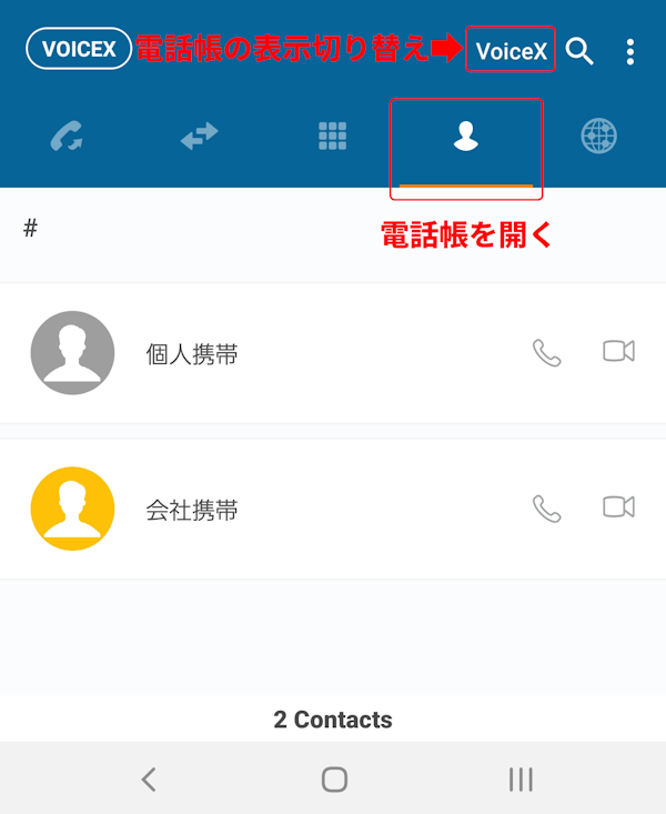 その後、上部メニューに表示されている「アドレス帳のマッチング│VoiceX」というボタンで、「VoiceX」と書かれた部分をタップすると、連携した電話帳が表示されます。