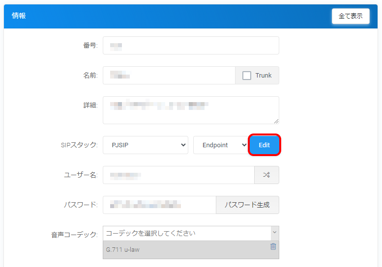 「情報」の「SIPスタック」の右側にある、青い「Edit」ボタンをクリックします。