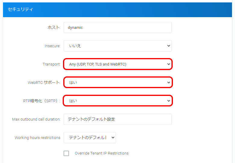 | RTP暗号化(SRTP) | 「はい」を選択します |