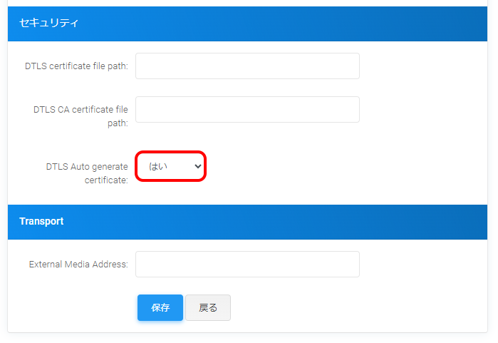 「PJSIPエンドポイント設定」が開いたら、「セキュリティ」の「DTLS Auto generate certificate」で「はい」を選択し、下部の青い「保存」ボタンをクリックし設定を保存します。(設定を保存すると内線設定画面に戻ります)