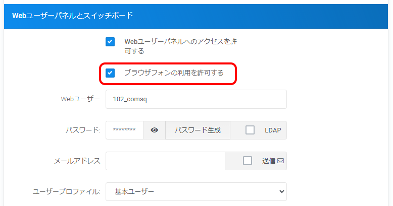 最後に、「Webユーザーパネルとスイッチボード」の「ブラウザフォンの利用を許可する」にチェックを入れます。