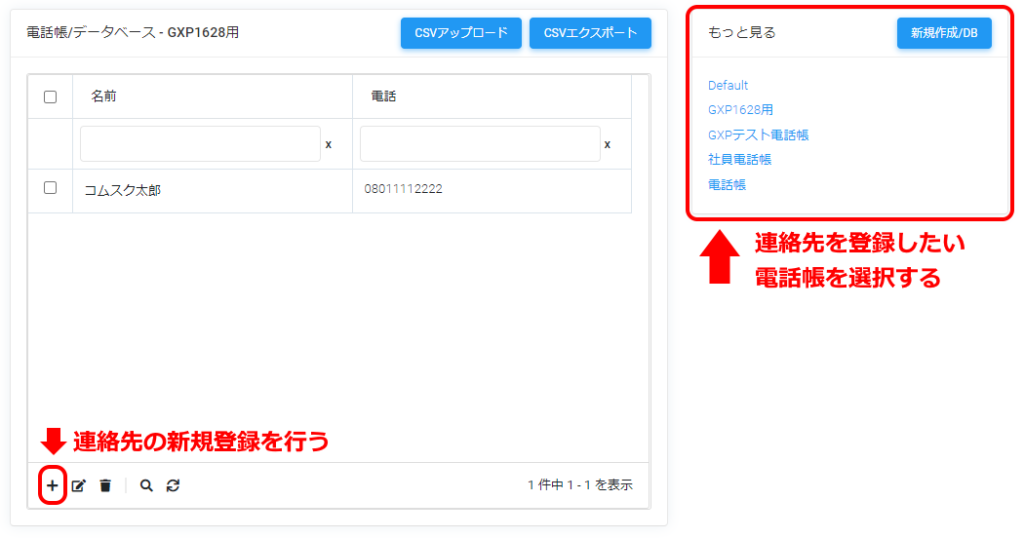 VoiceX管理画面で、固定電話機「GXP1628」用の電話帳の作成及びその電話帳へ連絡先を登録する方法、電話帳の連携方法について説明します。