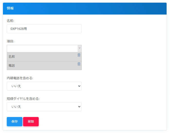 「名前」には任意の管理名を、「項目」には電話帳に含めたい項目の内容をプルダウンから選択します。