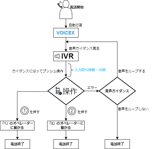 その後、入力タイムアウト(本設定では10秒間ボタン入力が行われなかった)や入力間違い(IVR設定で定義されていないボタン入力が行われた)が起きた時、「繰り返し時の音声再生方法」で選択した内容によって繰り返しの際の音声再生方法が変わります。