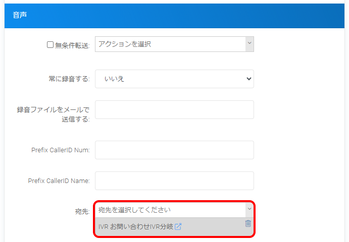 設定したい外線番号の設定画面を開いたら、「音声」にある「宛先」で、あらかじめ作成したIVR設定を選択してください。