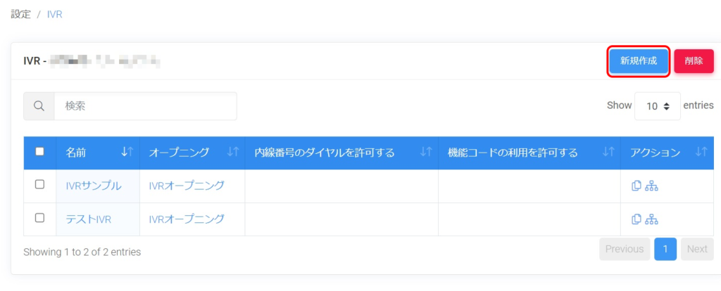 IVRの新規作成を行いたい場合は、一覧画面右上の「新規作成」ボタンをクリックし、設定画面を開きます。