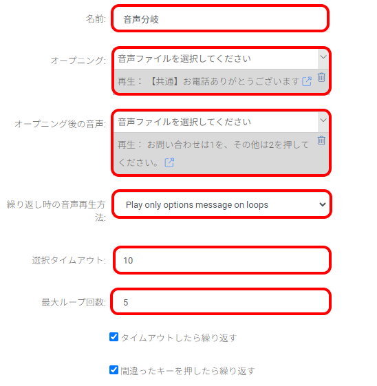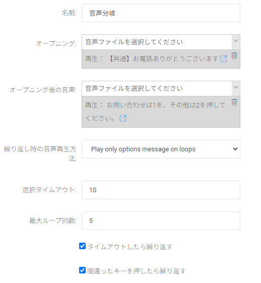 | 最大ループ回数 | 電話をかけてきたユーザーの操作エラー時に音声再生を繰り返す最大回数を設定します 本項目の値は初回動作時も含みますので、繰り返したい回数+1の値を入力してください (例:1回の入力誤りを許容し、2回目の入力誤りが起きた場合に通話を終了させたい場合は2を入力/1回だけループさせたいのならば2を入力) 最大ループ回数を超えた場合は通話を終了します 最大ループ回数を動作させたい場合は合わせて、「間違ったキーを押したら繰り返す」にもチェックを入れてください |