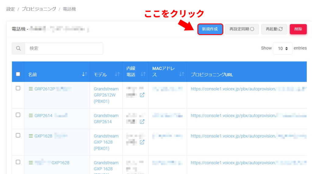 電話機のプロビジョニングの新規作成を行いたい場合は、一覧画面右上の「新規作成」ボタンをクリックし、設定画面を開きます。