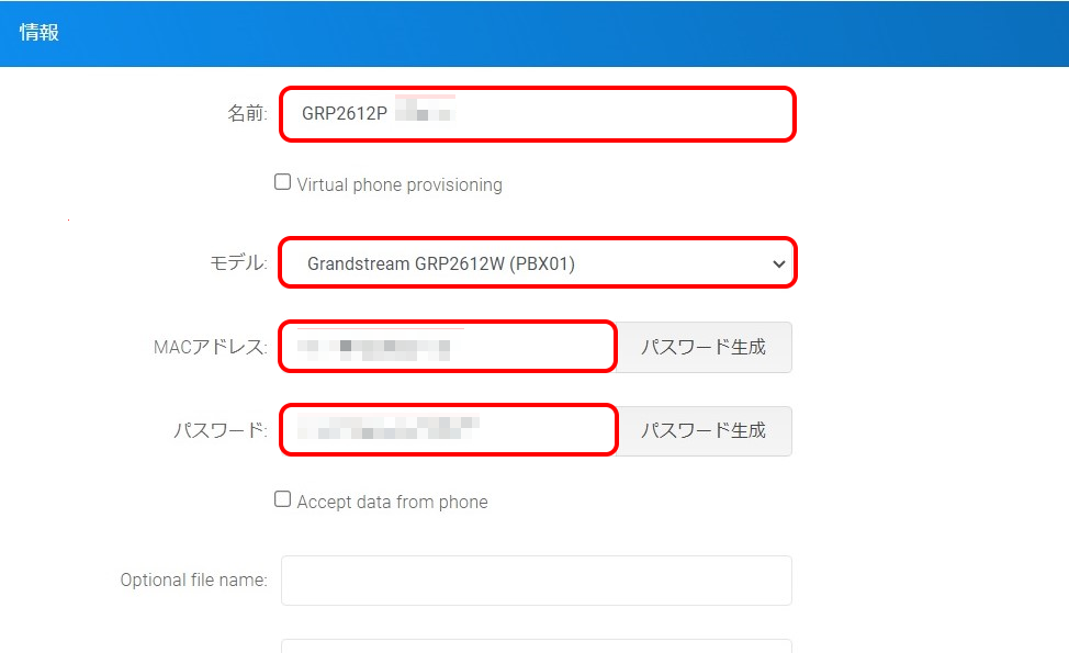| MACアドレス | 設定したい電話機のMACアドレスを入力します MACアドレスは各電話機または電話機側の管理画面で確認可能です。 確認方法については機種によって異なりますので、電話機の説明書等をご確認ください。 |
