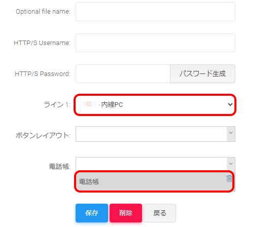 | ライン1 | 設定したい電話機に紐づける内線を選択します 選択した電話機によってはラインが複数ある場合がありますが、基本的にライン1のみをご使用ください。 紐づける内線はあらかじめ作成してください 内線の新規作成については「内線設定について」をご確認ください |