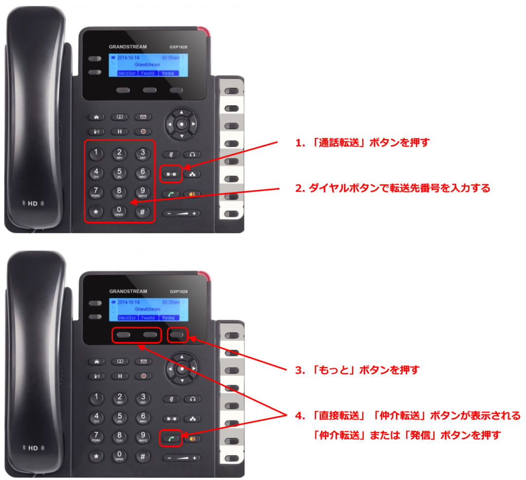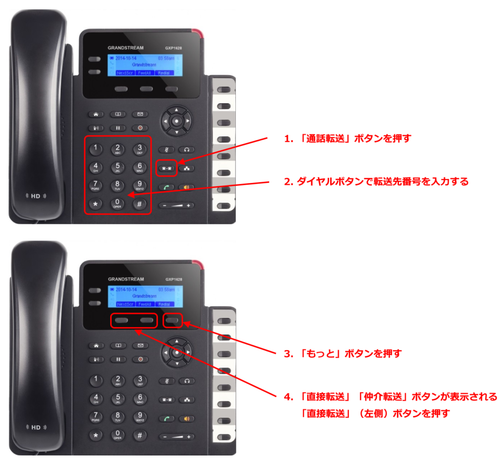 電話機「GXP1628」で、かかってきた通話を受けた状態で、その通話を別の内線へ転送する方法について説明します。