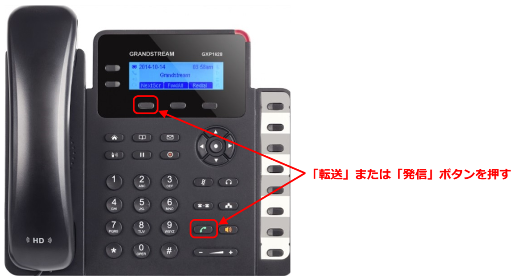 2者通話を行っている状態で、キーパッドボタンの「通話転送」ボタンを押します。