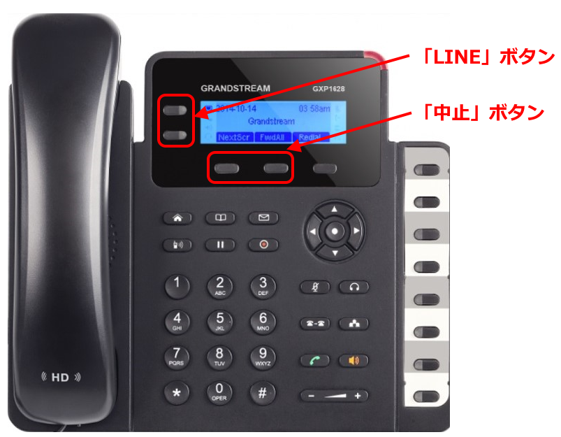 転送先へ発信中にその発信を中止し、保留状態を解除したい場合は、真ん中のプログラマブルキーボタンを押し、「LINE」ボタンのLEDが点滅しているボタンを押すことで保留状態が解除され、発信者との通話が再開されます。