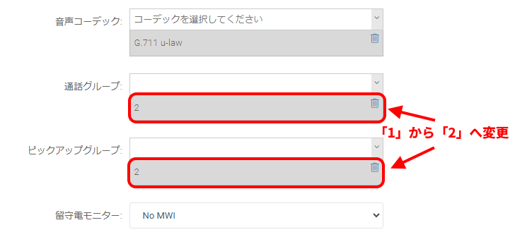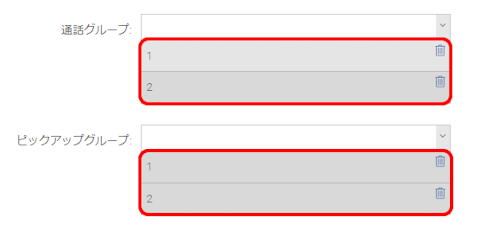 「通話グループ」と「ピックアップグループ」で、それぞれ「1」が設定されている箇所のゴミ箱アイコンをクリックし、「1」を削除し、画面下部にある[保存する]を押して設定を保存します。