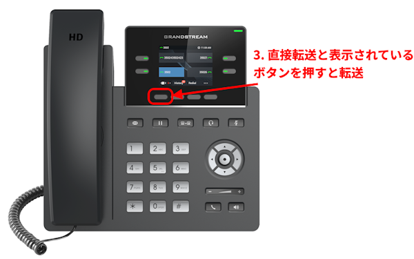 「ダイヤル」ボタンで転送したい番号を入力し、電話機のディスプレイに「直接転送」と表示されているボタンを押すと直接転送を行います。