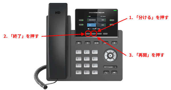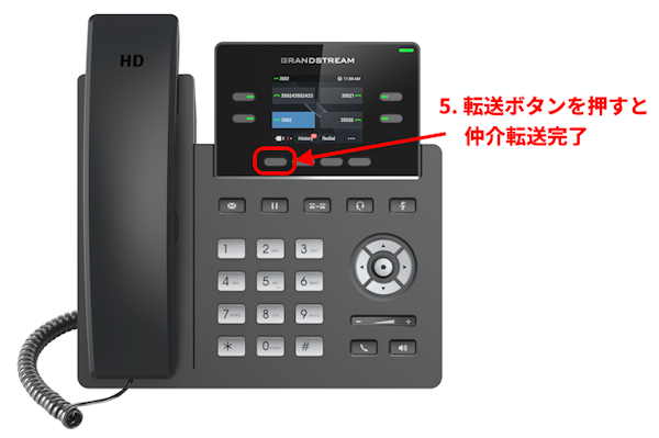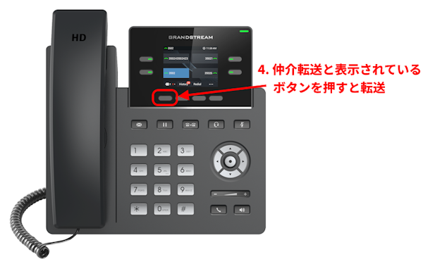 2者通話を行っている状態で、キーパッドボタンの「通話転送」ボタン(電話機が2つ並んだアイコンの物理ボタン)を押します。