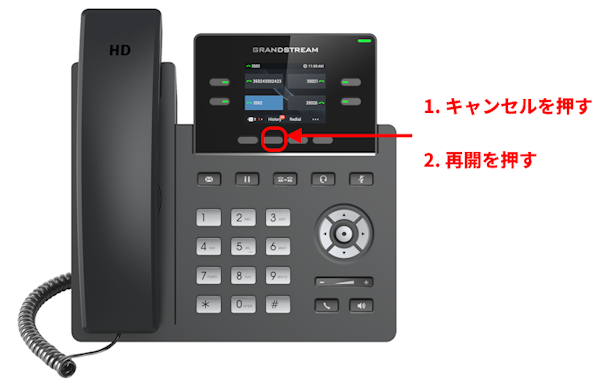 仲介転送先への発信中(呼び出し中)の時はディスプレイに「キャンセル」と表示されているボタンを押して仲介転送をキャンセルした後、「再開」と表示されているボタンを押しことで保留を解除できます。