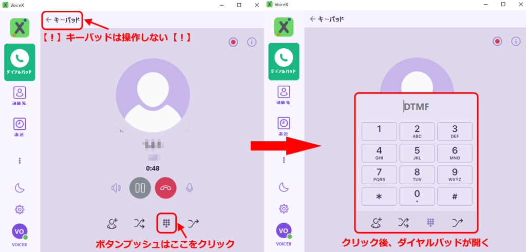 PCソフトで通話中、「◯◯の方は1を押してください」等の音声ガイダンスに従ってボタンプッシュを行う必要がある場合、ボタンプッシュはキーパッド(電話をかける画面)に戻って行うのではなく、通話中の画面にDTMFボタンをクリックし、ダイヤルパッドを開いてボタンプッシュ操作を行ってください。