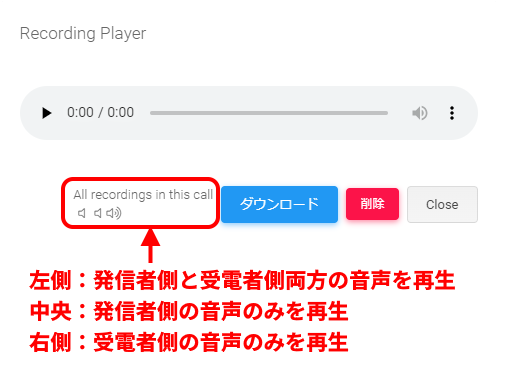 真ん中のスピーカーアイコンをクリックして再生ボタンを押すと、発信者側のみの音声が再生されます。