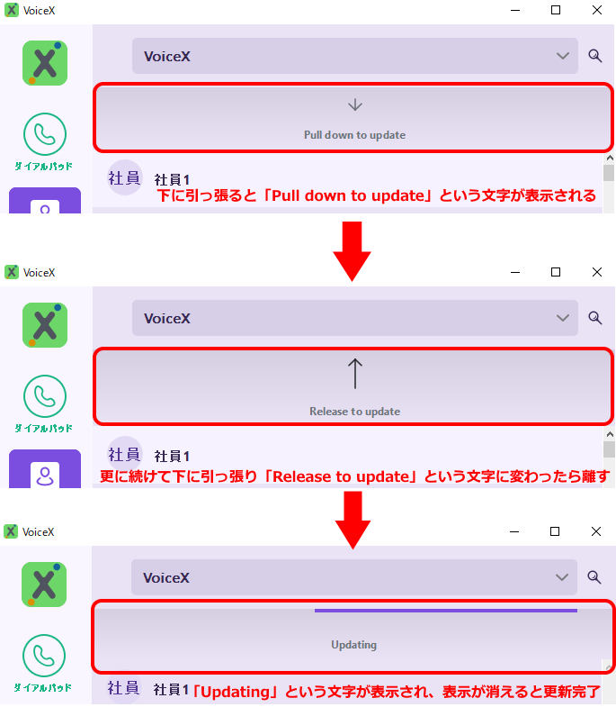 また、電話帳のプロビジョニングは60分間隔で行われます。この間隔を変更することはできませんが、固定電話機であれば再起動や下に引っ張って更新、アプリであれば再起動または電話帳が表示されている画面でスワイプ操作や下に引っ張って更新を行うことで即時反映することができます。