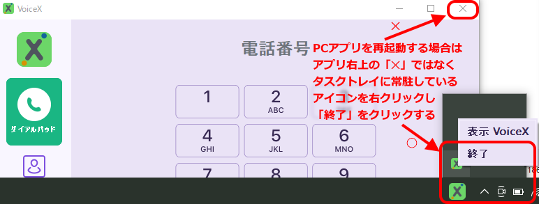 PCソフトを再起動される際は、アプリ右上の閉じるボタン「✕」ではなく、PCのタスクトレイに常駐しているVoiceX Desktopのアイコン上で右クリックしメニューの「終了」をクリックして終了してください。アプリ右上の「✕」では最小化されるのみで、終了にはなりませんのでご注意ください。