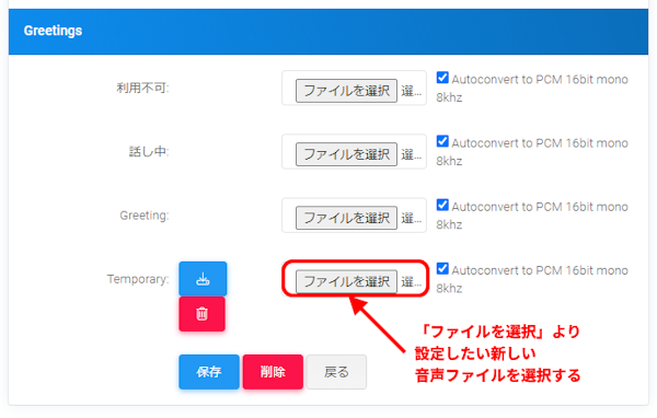 留守番電話ボックス内に指定している音声ファイルを変更したい場合は、変更したい留守番電話ボックスの設定を開き、「Temporary」にて新たな音声ファイルを選択し、設定を保存してください。