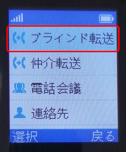 「選ぶ」を押した後、転送メニューが表示されます。一番上の「ブラインド転送」を選択します。