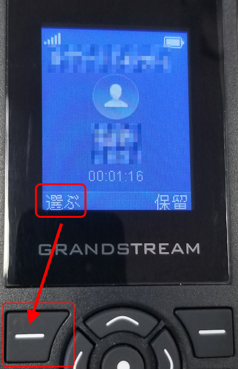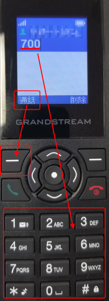 保留1(内線番号700)にパーク保留した場合は、ダイヤルボタンで「700」を押し、ディスプレイ左下に表示されている「通話」の文字の下の白い横線「━」が書かれたボタンを押すことで、パーク保留された通話を取ることができ、そのまま発信者との通話が再開されます。