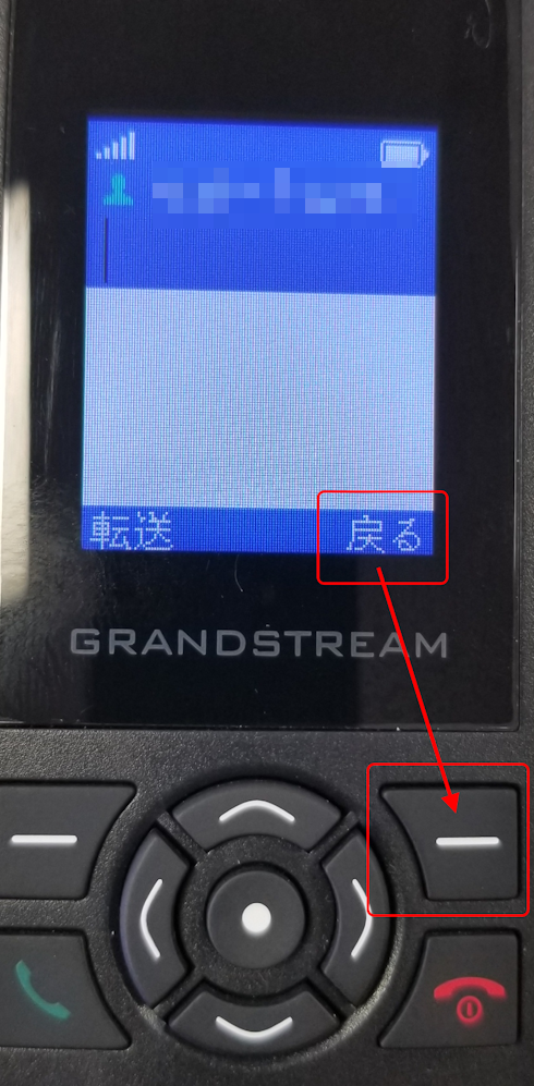 ブラインド転送を行う前、保留状態を解除したい場合は、ダイヤル画面が表示されている状態で、ディスプレイ右下に表示されている「戻る」の文字の下の白い横線「━」が書かれたボタンを押すと、通話画面に戻ります。